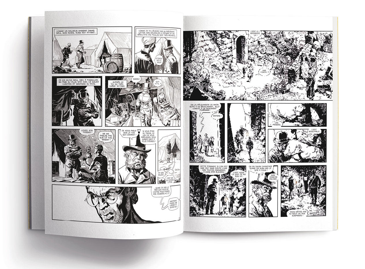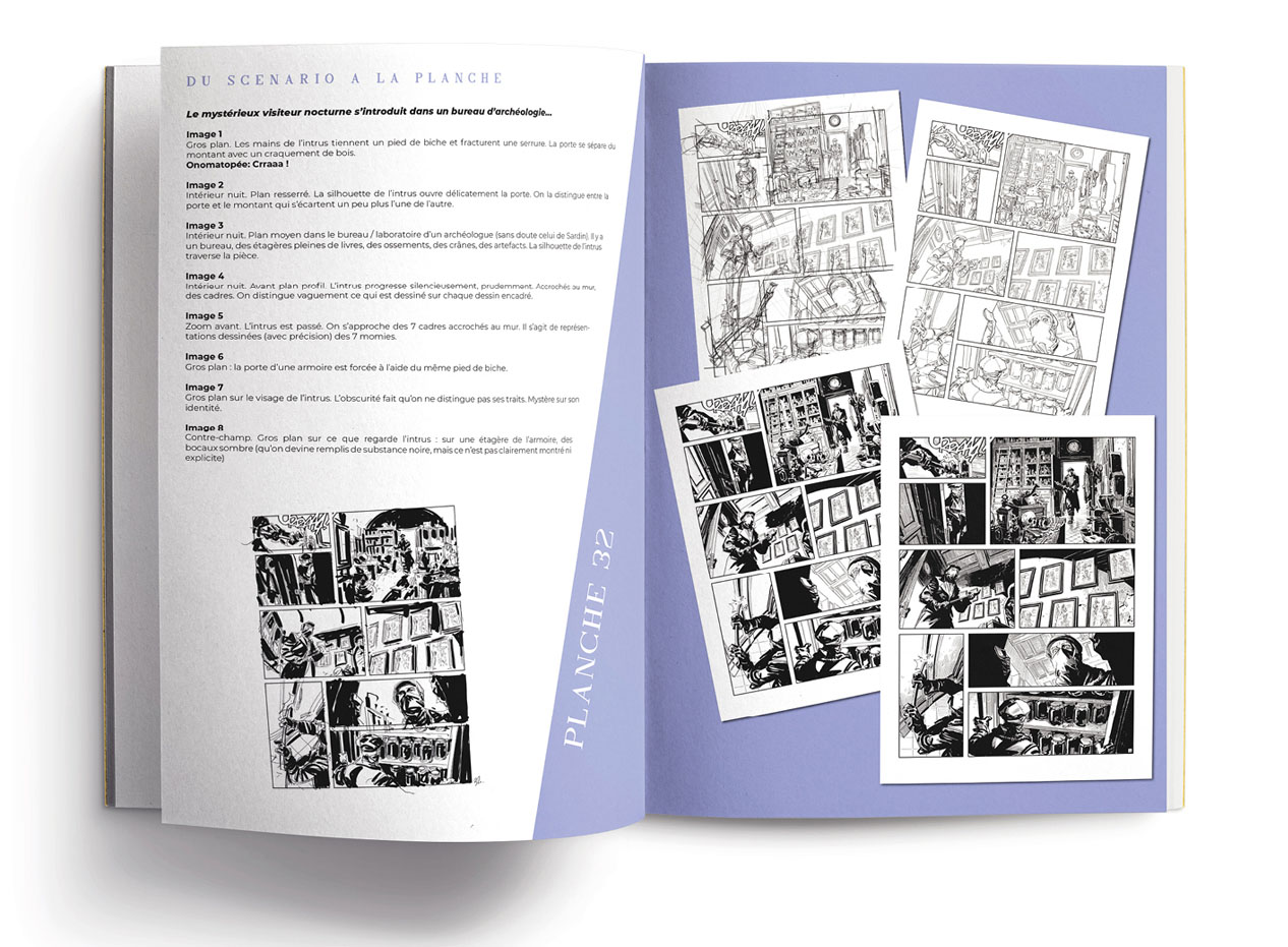Album 36 x 27 cm imprimé sur papier Munken, avec dos toilé et marquage à chaud. Le tirage est constitué de 46 planches de récit en impression noir intense et de 32 pages de bonus (cahier graphique, scénario illustré) en impression quadrichromie.
