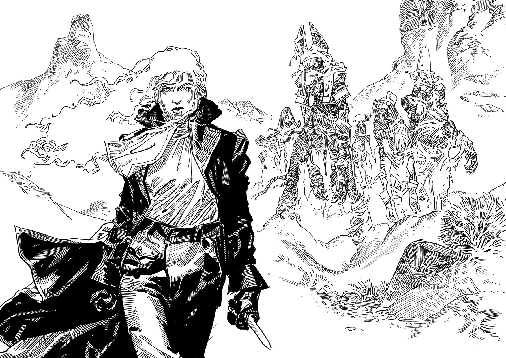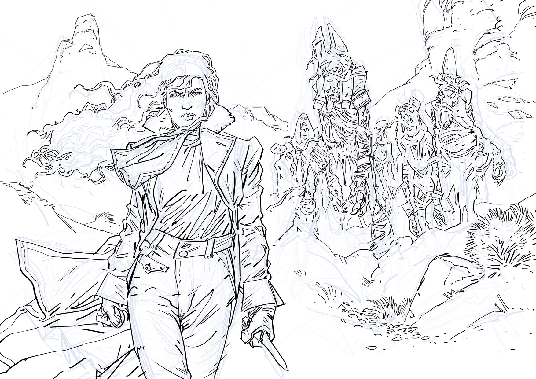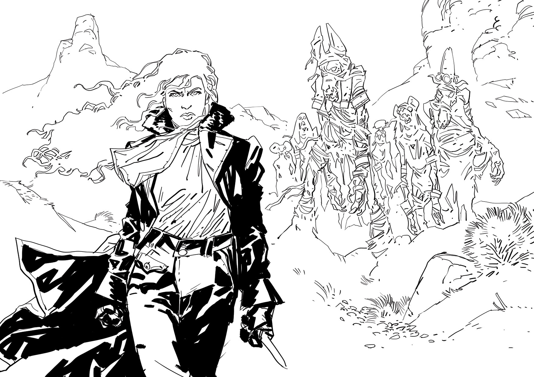 Étape par étape, découvrez comment une illustration de la Légende des Stryges prend vie sous les traits et l'encrage de plus en plus fins et détaillés de Nicolas Bègue.