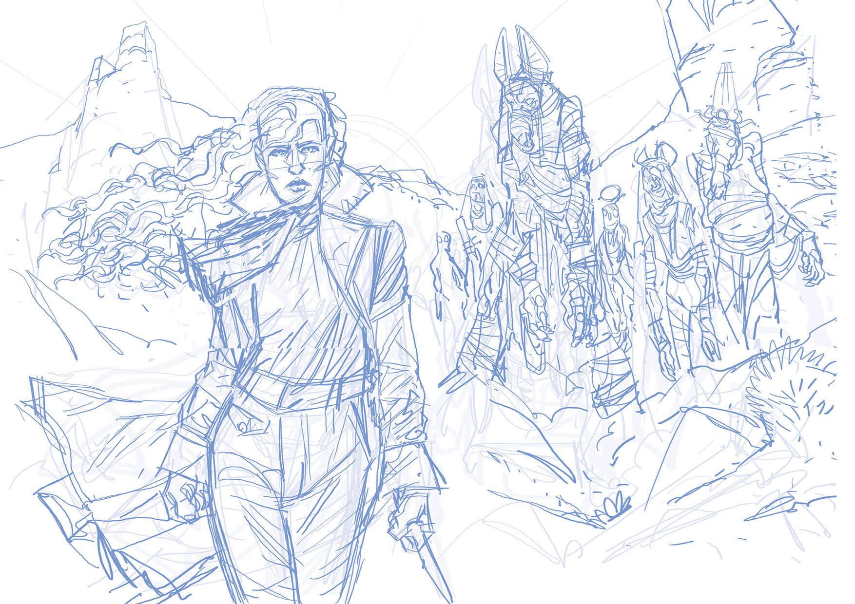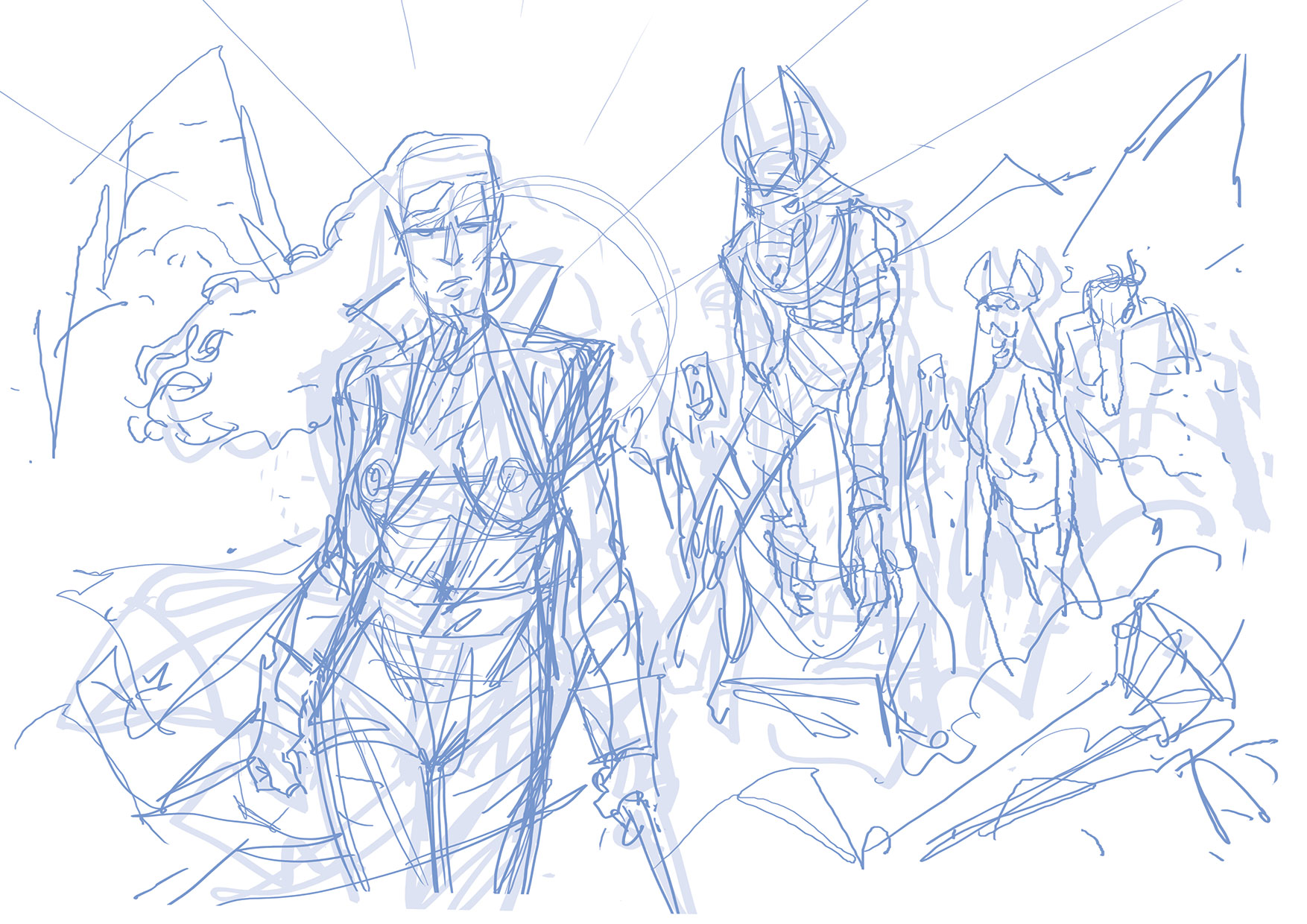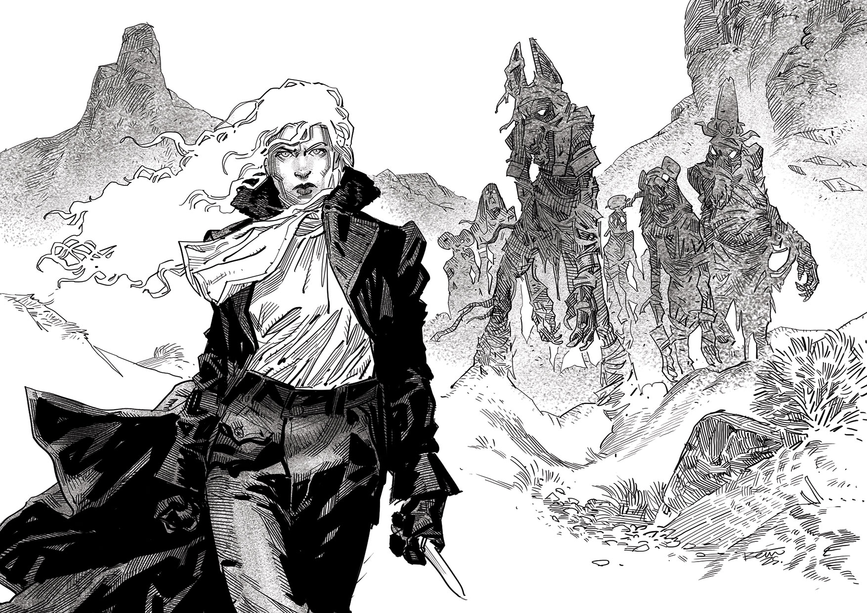 Étape par étape, découvrez comment une illustration de la Légende des Stryges prend vie sous les traits et l'encrage de plus en plus fins et détaillés de Nicolas Bègue.